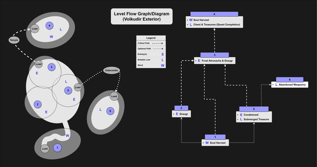 The last and shortest dungeon of this questline. It simply houses a few rooms for looting and the final scene and boss fight in the specter's very large sanctum (3) at the end of the level. It contains the most difficult combat encounter of the project and after quest completion the path behind the specter's throne opens. This path (4) leads directly into an area of the Volkudir Ruins World space that contains a word of the Soul Harvest shout and a large amount of loot as a reward.