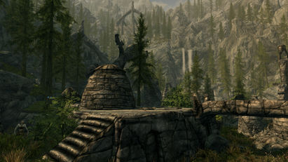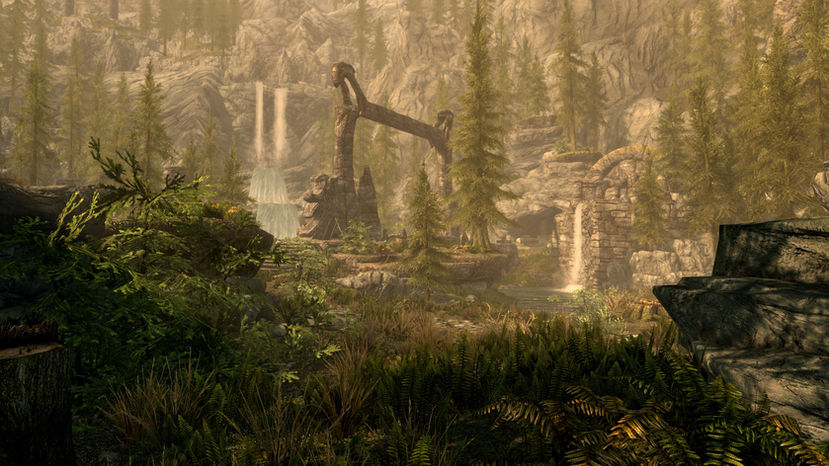 The ruins of Volkudir are a beautiful place. Lightly snow-covered trees upon steep abrupt mountain peaks all surround the river valley below. Guard outpost occupied by draugr scatter strategically throughout. All though no matter the level of beauty, the evil persists. Here the mages pursue their soul experimentation throughout the connected armory, catacombs, and temple.